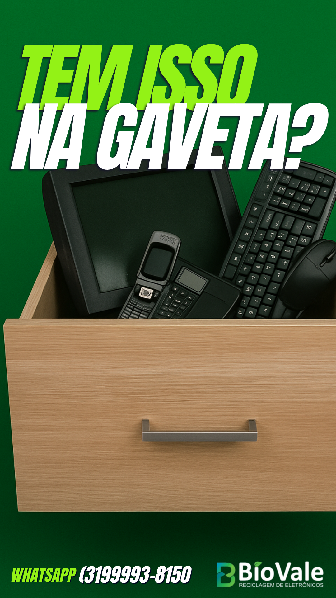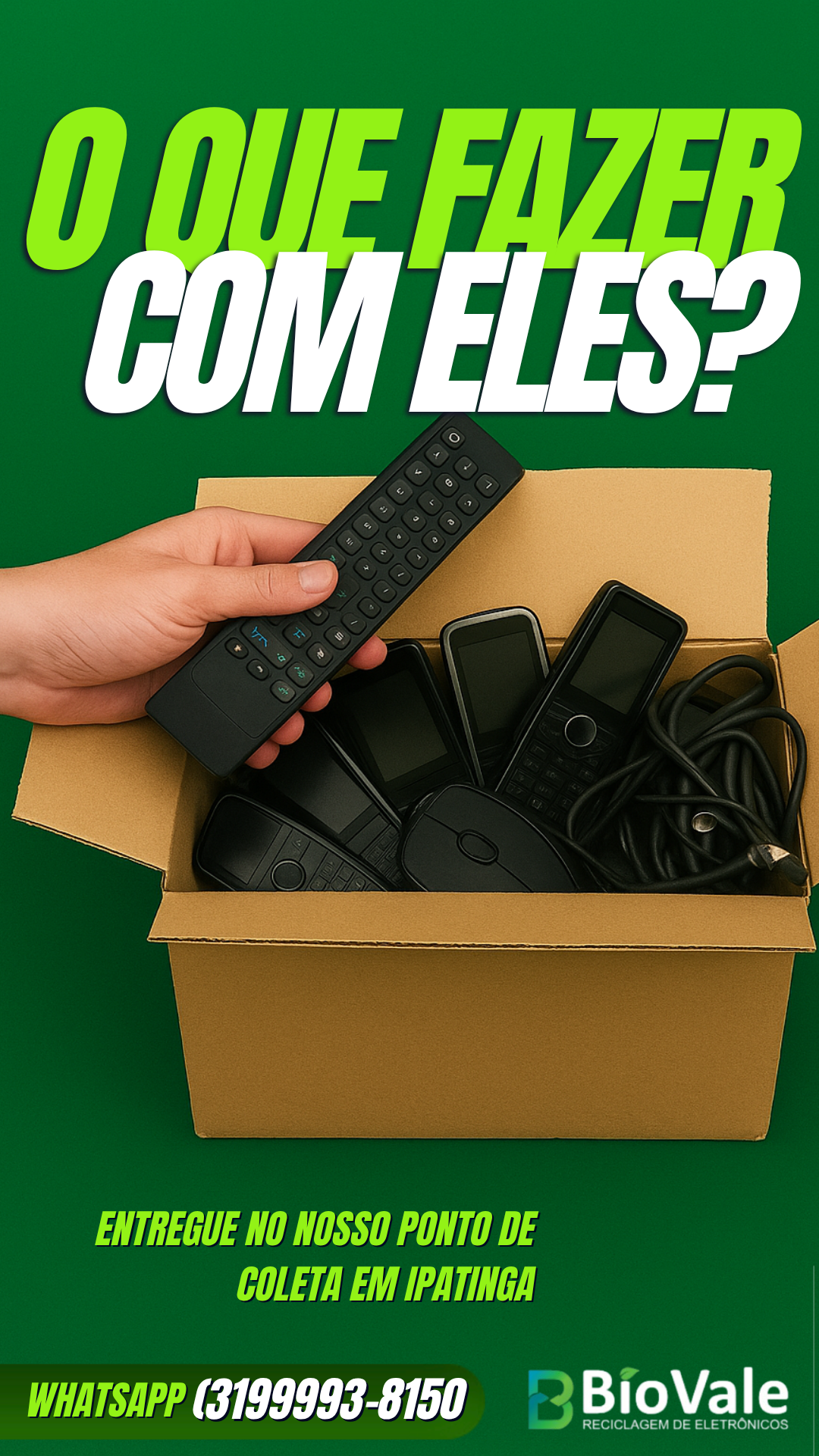 A BioVale é especializada no gerenciamento sustentável de resíduos eletrônicos, com compromisso genuíno em proteger o meio ambiente, prevenir a poluição e preservar recursos naturais. Atuamos na reciclagem de equipamentos como computadores, celulares, TVs, aparelhos de som e mais. Também oferecemos a venda de produtos eletrônicos remanufaturados, promovendo o reuso e a sustentabilidade. O QUE É LIXO ELETRÔNICO?Lixo eletrônico é tudo aquilo que liga na tomada ou usa baterias e pilhas. Lixo eletrônico tambem e conhecido como: Sucata eletrônica E-lixo Resíduos eletrônicos. Localizada em Ipatinga/MG, na Av. Sanitária 2311, Limoeiro. Fale conosco: WhatsApp (31) 99993-8150.